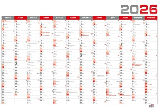 Kalendář nástěnný, roční, červený 2026