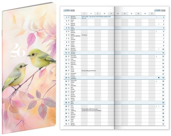 Diář měsíční, kapesní, 8x18 cm, Ptáčci 2026