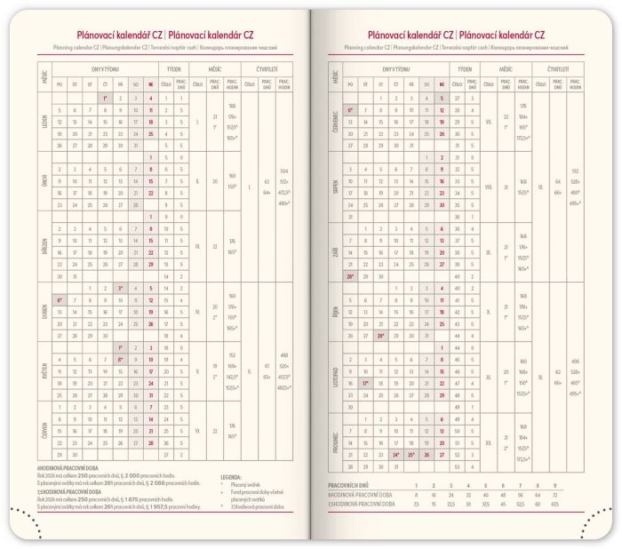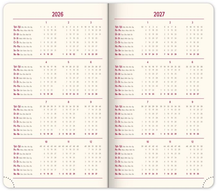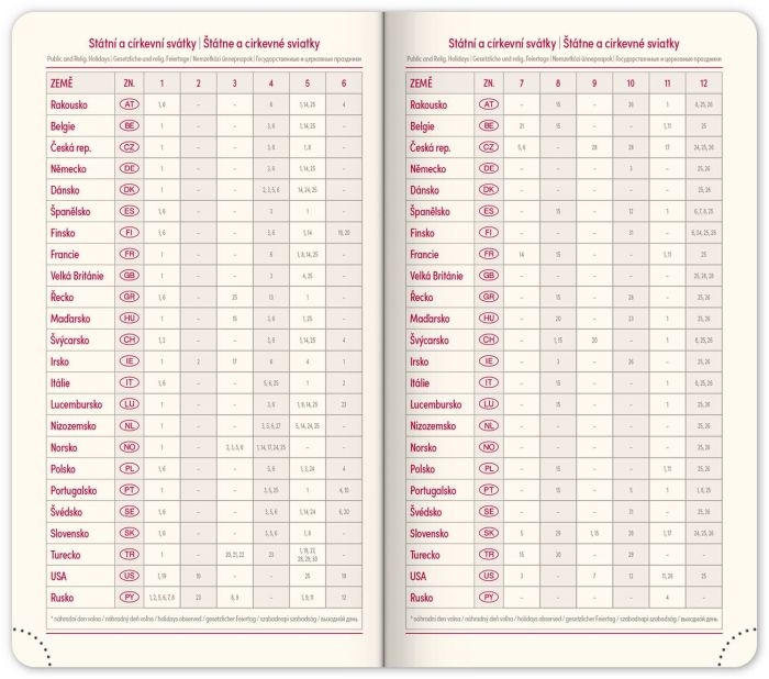 - kalendárium: šestijazyčné (CZ, SK, EN, DE, HU, RU) týdenní jmenné