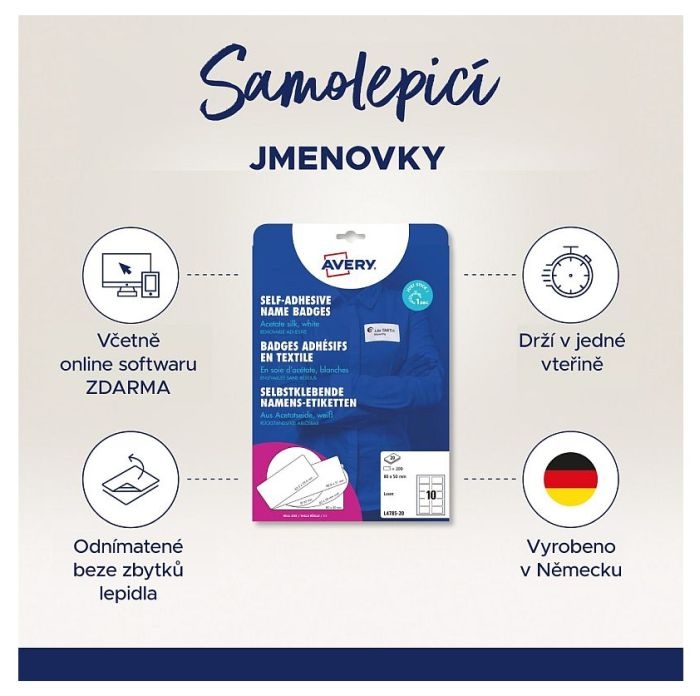 - každou jmenovku lze vyjmout z archu i s částí podkladového papíru a po skončení akce ji znovu přilepit a uschovat pro pozdější použití